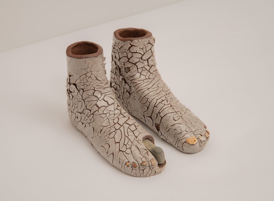 Elizabeth Atterbury, Second Feet (Molting) (detail), 2025, Ceramic, glaze, shells, rock, 9 3/4 x 6 x 3 inches (each foot). Photo by Boru O’Brien O’Connell.