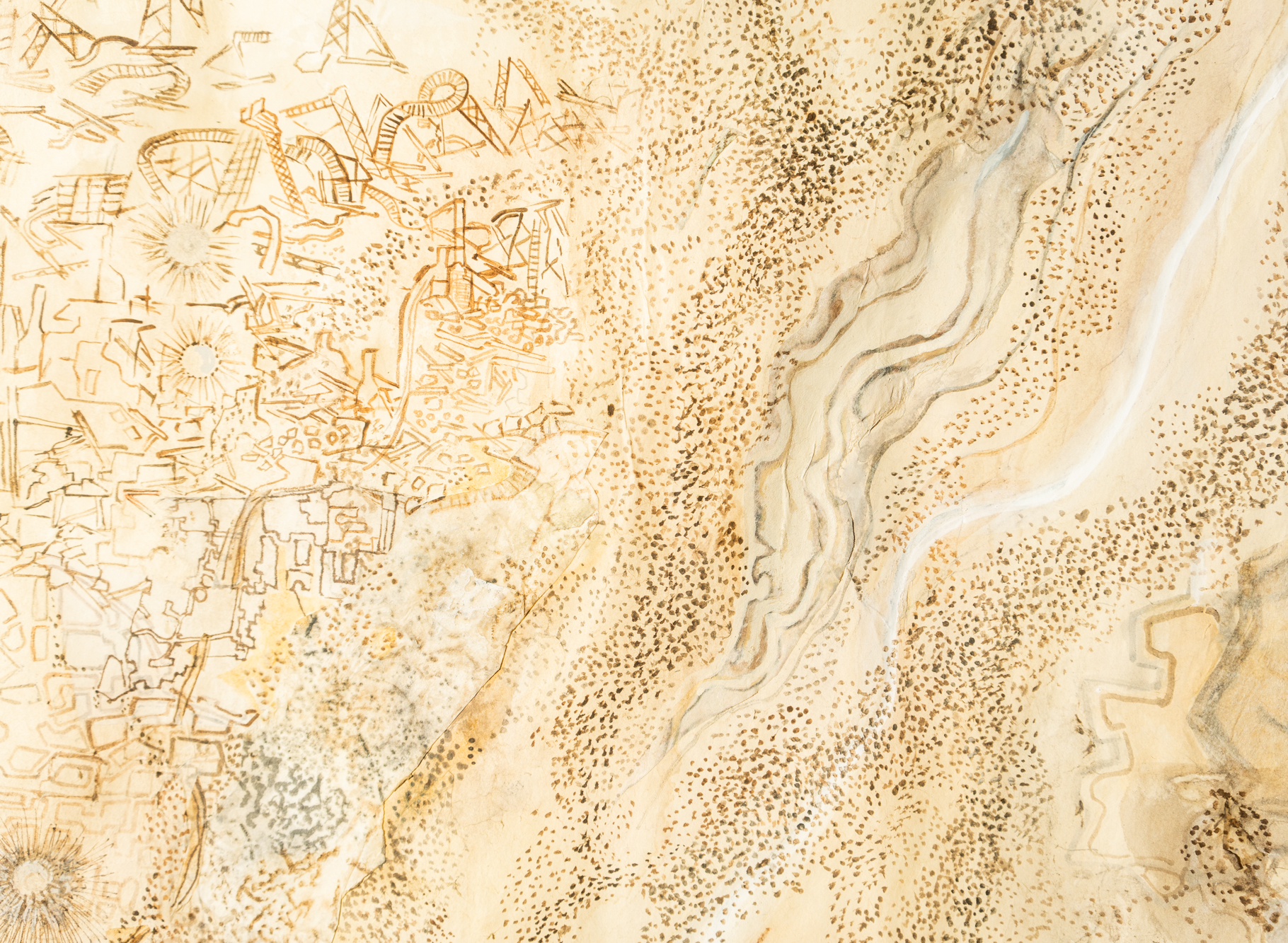 The works on view will include large-scale mixed media work on Gampi paper featuring aerial views of the earth, paired with similarly scaled oil paintings on canvas offering views of planets and other celestial bodies. The shifting perspective and media selections between the two series offer an exciting view into Hildreth’s dynamic artistic practice.