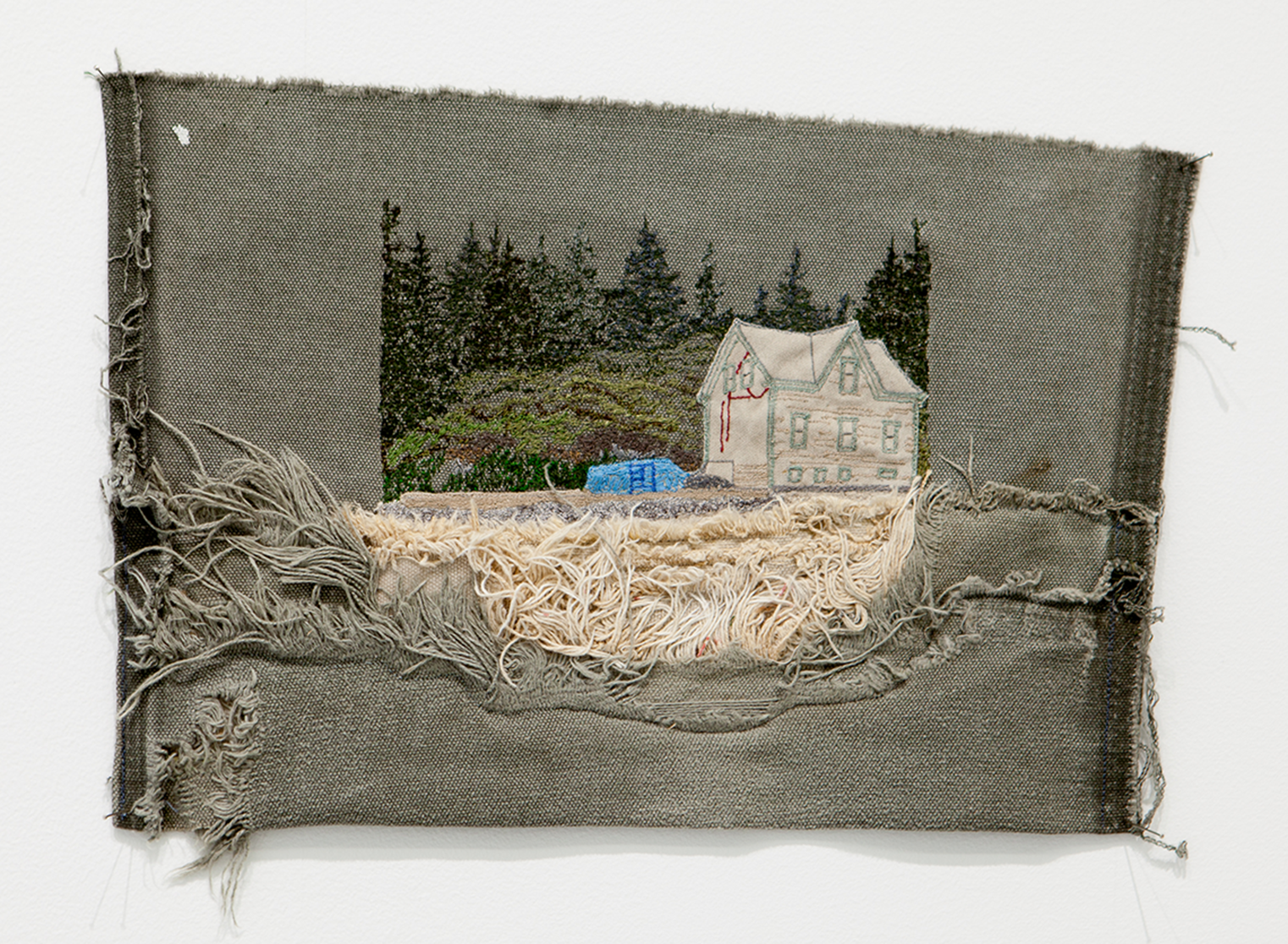 Diana Cherbuliez, Homemaker (6), 2017, Worn-out Carhartt work pants, thread, 8 1/2” x 12 3/8”, Courtesy of Grant Wahlquist Gallery