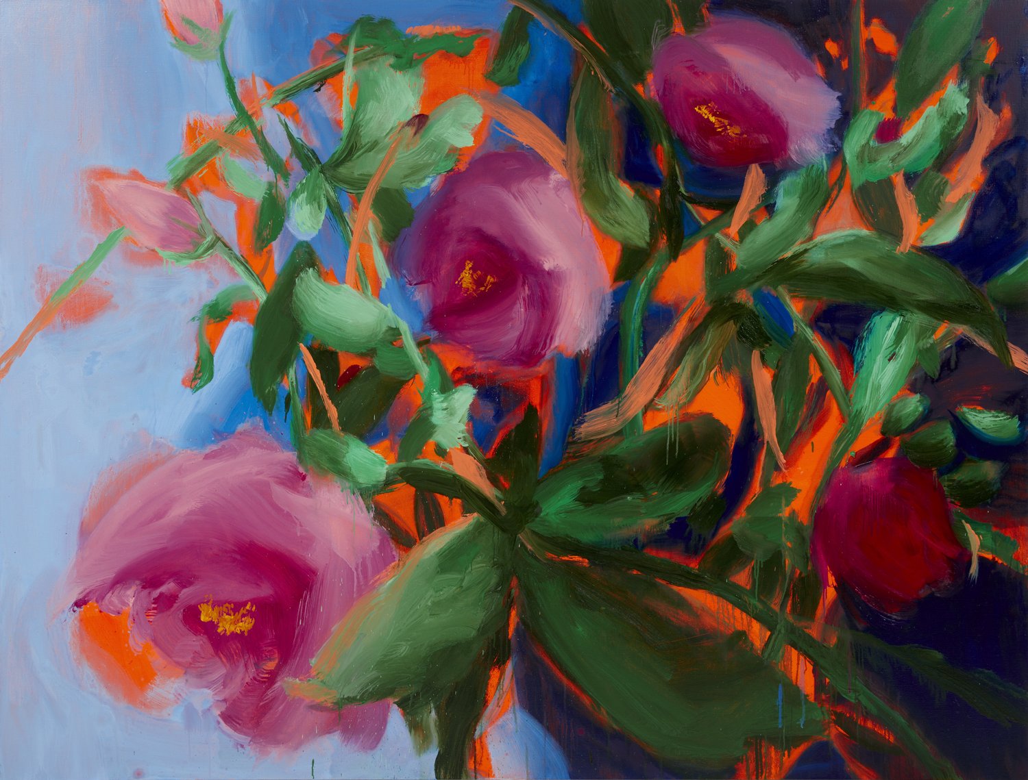Taking its title, Cheek to Cheek, from the iconic 1935 song composed by Irving Berlin, for his musical Top Hat, “heaven, I’m in heaven, and my heart beats so that I can hardly speak…” the exhibition at CMCA embraces the viewer in the heart-stopping sensuousness of Wittenberg’s floral compositions. Vibrating with energy, the seductive, electric-hued blooms fill the canvas and the eye. The artist “sees these new paintings as a group of interlocking forms that overlay to create a massing of stems, flowers, and leaves—in that way, these are Baroque images, where the ‘parts’ of the painting fit together and spiral upwards.”