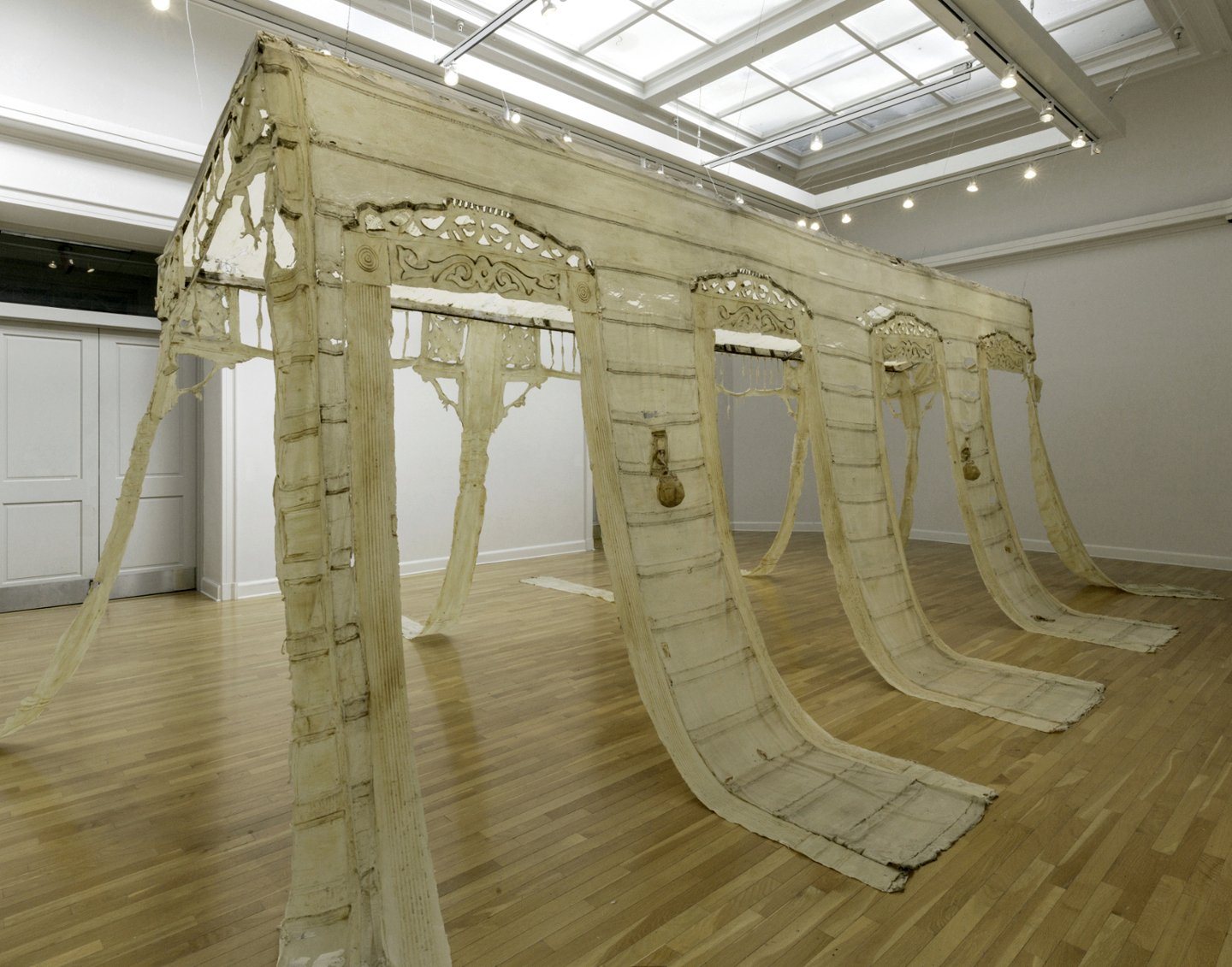 Metaphor is essential to Carlie Trosclair’s work: architecture as body, architectural surface as skin, latex as skin, the domestic space as a vessel of memory and past lives. The resulting sculptures and installations explore the vulnerability and ephemerality of home, as both a physical space and a concept. The poetic takes on a visceral existence in Trosclair’s ghostly sculptures—created by painting liquid latex onto man-made and natural surfaces, allowing it to dry, and then peeling it away. The milky liquid (tapped from rubber trees), applied in multiple layers, dries to a translucent amber. At times, the latex picks up color from the original surface; in other works, the artist adds natural pigment to suggest the passage of time.